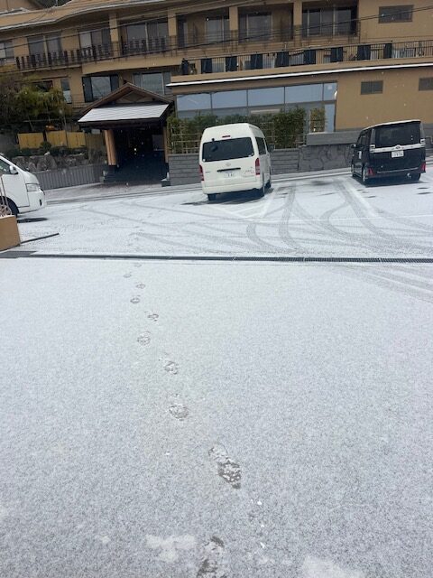 貸し切り風呂二の湯からの朝方の雪景色 竹取亭前の道路にエンカリを三袋を 効果はす···